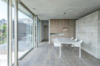 Diese sinnliche Materialität und feine Detaillierung setzt sich auch im Wohnhausinneren fort: Glatt- und brettgeschalte Sichtbetonkuben trennen offene Räume wie Zugangs- und Küchenbereich von Schlaf- und Ankleidezimmer, Boden und Einbauten in pigmentiertem Eichenholz harmonieren mit der prominenten Treppe aus Rohstahl. (lr)
