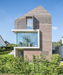 Das monolithische Erscheinungsbild des Baukörpers mit seiner scharfkantigen Kontur wird durch die Bretterhaut erreicht, die sich über das überstandlose Dach zieht. Einbauten wie Dachrinnen und Regenrohre verstecken sich unter der Bretthülle. Die scheinbar wenigen, sichtbaren Öffnungen – die zum Nachbarhaus orientierte Ostseite gibt sich geschlossen – verstärken die Wirkung der Fassadenarchitektur. Eine Geschlossenheit, die jedoch partiell nur vorgetäuscht ist: teils finden sich große Fenster hinter gelochten Abschnitten in der Brettschalung, die sich je nach Bedarf auffalten lassen. Desweiteren gibt es diverse Fensteröffnungen sowie eine eingesetzte Loggia im Dachgeschossbereich, wo die gelochten, flächenbündig gesetzten Faltschiebeläden bei Sonnenschein im Inneren eine orientalisch anmutende Raum- und Wohnatmosphäre erzeugen, erklären die Architekten.
