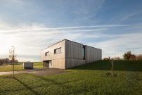 Es ist ein „Hof im Kleinen“ entstanden, der aus einem kompakten Gebäude und einem vielseitig nutzbaren Freibereich besteht. In Anlehnung an die landwirtschaftlichen Bauten der Nachbarschaft wurden die Fassaden mit unbehandeltem Tannenholz verkleidet. Zum Innenhof sind die Bretter dunkelgrau lasiert, die weiß lackierten Tür- und Fensterrahmen heben sich davon deutlich ab.