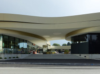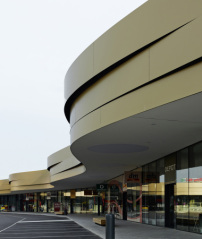 Die eigentliche Besonderheit des Projekts ist aber nicht die Promenade selbst, sondern ihre Überdachung. Weit auskragend, erinnert sie an gestapelte Goldbänder und fasst die verschiedenen Ansichten des Gebäudes visuell zusammen, sodass keine hässlichen Rückseiten entstehen. Dass das keine selbstverliebte Verschwendung ist, zeigt der Blick aus dem Zug über das Städtchen hinweg. Dort erhebt sich das weltberühmte Stiftsgebäude, auf dessen barocke Formensprache sich das Einkaufzentrum im Vordergrund nicht nur farblich bezieht, sondern auch mit den fröhlichen Schwingungen des Dachs.