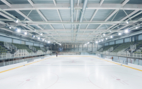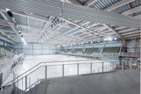 Die neue Eishalle steht in der Médiacité, auf einer Insel mitten in einem ehemaligen  Industriegebiet, das im Zuge eines städtebaulichen Masterplans transformiert und aufgewertet wird. Die direkte Nähe zu dem benachbarten Einkaufszentrum sowie der Zugang zum Parkplatz haben die Architekten zwar zu formalen Kompromissen gezwungen – dennoch ist ein auffälliger Solitär entstanden. Über die geschwungene, kuppelartige Kopfseite der Halle gelangen die Besucher in die Tiefgarage und in den Bauch des Wals. Die Eisfläche ist mit 30 mal 60 Metern die einzige mit olympischem Ausmaß in der Wallonie.
