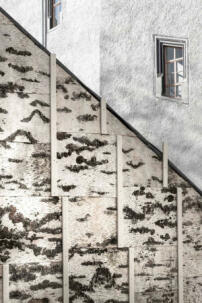 Vom Borkenhäuschen zum Birkenhäuschen: Helga Blocksdorf (Berlin) hat nun den Coudray’schen Bögen einen zeitgenössischen Portalbau mit einer Verkleidung aus Birkenborke hinzugefügt – sozusagen in Kontinuität der örtlichen Kulturgeschichte der Staffage. Mit ihrem Entwurf für ein Aussichtstor auf der bestehenden Mauer von Coudray, das durch eine große Freitreppe erschlossen wird, gewann Helga Blocksdorf 2019 den Wettbewerb der Klassik-Stiftung Weimar für ein Kulturportal. Mit solch temporären „Erlebnisportalen“, so mittlerweile die offizielle Bezeichnung des Projekts, will man die Wahrnehmung eher unbekannter Sehenswürdigkeiten verbessern. Sie stehen an viel besuchten Stellen der touristischen Landschaft und sollen auf weniger populäre Orte und Bauwerke verweisen.