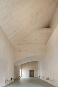 Die Idee eines Schaustücks führt Blocksdorf mit ihrem Team auch baukonstruktiv fort. Das Projekt ist ein Experiment mit dem historischen und heute recht ungewöhnlichen Baumaterial Birkenrinde. Eine helle und leichte Hülle aus natürlich gebogenen Borkenscheiben bildet die Außenhaut des Gebäudes. 225 Quadratmeter Fassadenfläche wurden so verkleidet. Die Wände dahinter sind aus 16 bis 18 Zentimeter breitem Kreuzlagenholz, das Pultdach ist aus dem gleichen, nur etwas breiteren Holzlamellensystem und mit Blech abgedeckt.
