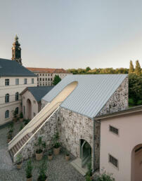Das Material ließ Blocksdorf mit einer transparenten Lasur zur Verbesserung des Brandschutzes behandeln. Diese simple, leicht de- und remontierbare Konstruktion ragt in einer Breite von 16 Metern über der Coudray’schen Mauer hervor. Für bis zu fünf Jahre und ganzjährig nutzbar soll das Kulturportal sein. Ein Ausstellungsraum bietet 78 Quadratmeter Fläche. Dessen Decke reicht gut zehn Meter in die Höhe, in die sich effektvoll die umwölbte Ausstellungsplattform schiebt.
