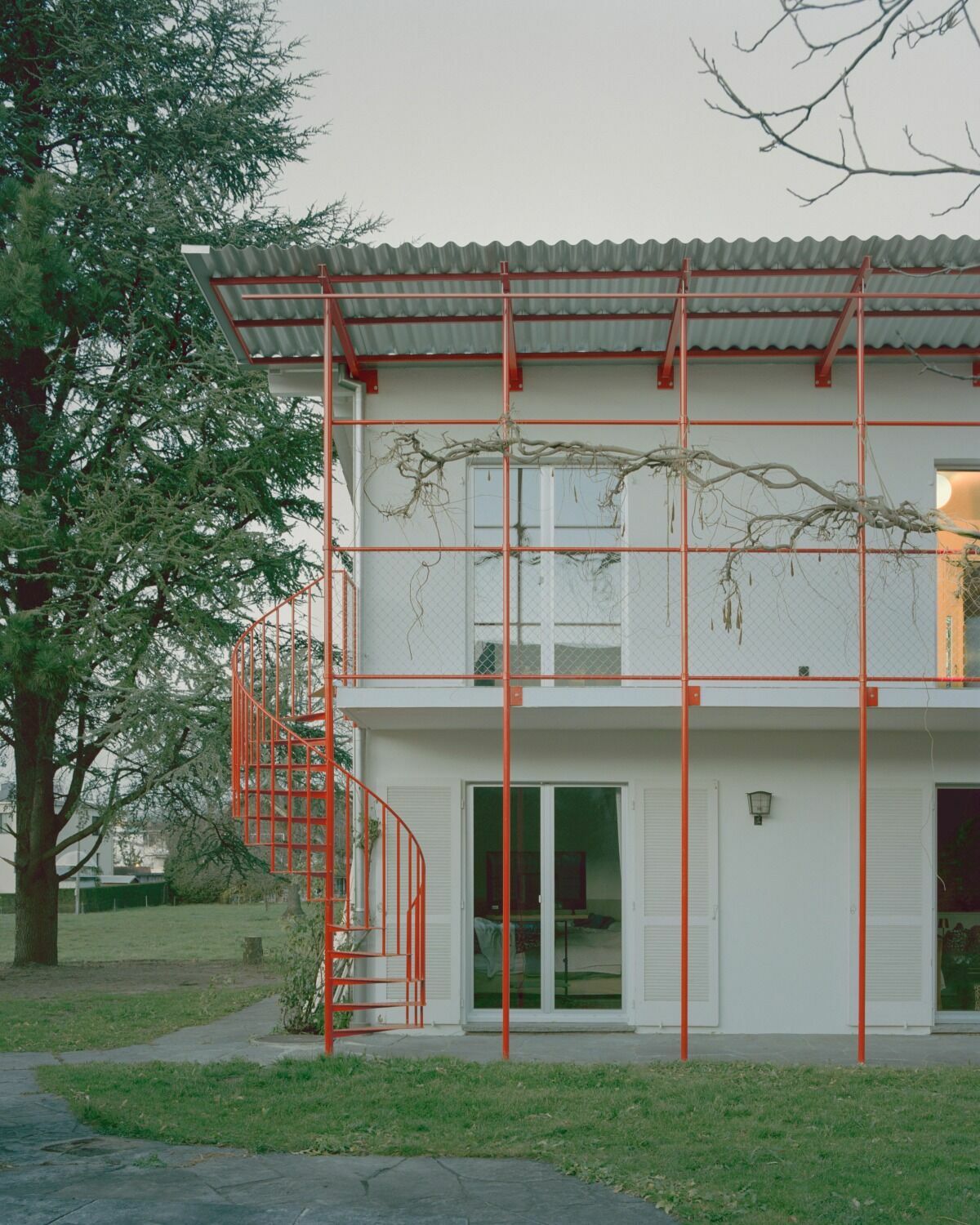 Eine stählerne Pergola verhilft der ehemals von der südlichen Dachfläche überragten Terrasse – die maßgeblichste Überformung des Bestands aus den 2000er Jahren – zu mehr Eigenständigkeit. Die Rankhilfe ist eine von drei roten Additionen, die das Umbauprojekt wie eine Klammer fassen. Die beiden anderen sind eine Außentreppe mit Vordach im Nordosten für die neue Wohnung und ein Laubengang mit Wendeltreppe im Südwesten für den sommerlichen Wärmeschutz. (kms)