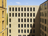Die Fassade aus profilierten Keramiktafeln orientiert sich in Material, Farbe und Textur am Bestand – ebenso die Proportionen der Fensteröffnungen. Durch die fassadenbündige Verglasung soll die skulpturale Präsenz des Baukörpers betont werden. In der Gesamtansicht wechseln sich die Fensterelemente mit den großen Keramikfeldern ab. In der Nahansicht hebt sich das horizontale Relief hervor, wodurch leichte Schatten die Fassade plastisch erscheinen lassen. Der gleichmäßige Rhythmus der Fenster wird einzig durch die übergroßen Formate im Sitzungssaal variiert, was dessen Bedeutung nach außen unterstreicht.