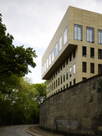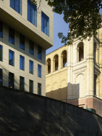 Der Neubau mit seiner Fassade aus Keramiktafeln und der klaren geometrischen Figur fügt sich nach Auffassung der Architekten „präzise eingepasst, gestalterisch zurückhaltend, aber ausdrucksstark in der Kubatur“ in das Ensemble von historischer Monumentalität ein – oder anders ausgedrückt: Der Bau ist „still, stark und sparsam“. Mit der Auskragung des Saalgeschosses setze er aber zugleich einen selbstbewussten Akzent. Der Neubau sollte ökologischen Vorbildcharakter haben und erfüllt daher den Passivhausstandard.