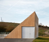 Zudem wurde das Klärwerk um drei Zugänge zu den unterirdischen Leitungen ergänzt. Oberirdisch sind diese als Solitäre mit gleichschenkligem dreieckigen Schnitt ausgebildet. Zur besseren Orientierung auf dem Gelände unterscheiden sie sich in der Färbung des mit starker Struktur geschalten Betons deutlich – was den Lehrbuchcharakter der Einrichtung nur unterstreicht. (kms)