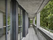Die Wohnungen sind nach Süden oder Westen orientiert. In Richtung Straße erweitert der Balkon die Wohnfläche nach außen, die bodentiefen Fenster der hier befindlichen Wohn- und Schlafzimmer lassen sich vollständig öffnen. An der Hofseite erschließen Laubengänge die Wohnungen. Sie sollen zugleich als Gemeinschaftsbereiche dienen. Geschosshohe Wandflächen aus Glasbausteinen – ein Element, das sich auch im Bestand findet – schaffen eine visuelle Verbindung zu den Apartments und verbessern zugleich deren Belichtung auf dieser Gebäudeseite. Auch das Innere der Wohnungen ist durch Beton- und Holzoberflächen charakterisiert. Die Baukosten lagen bei 28 Millionen Schweizer Franken, also circa 30 Millionen Euro. (da)