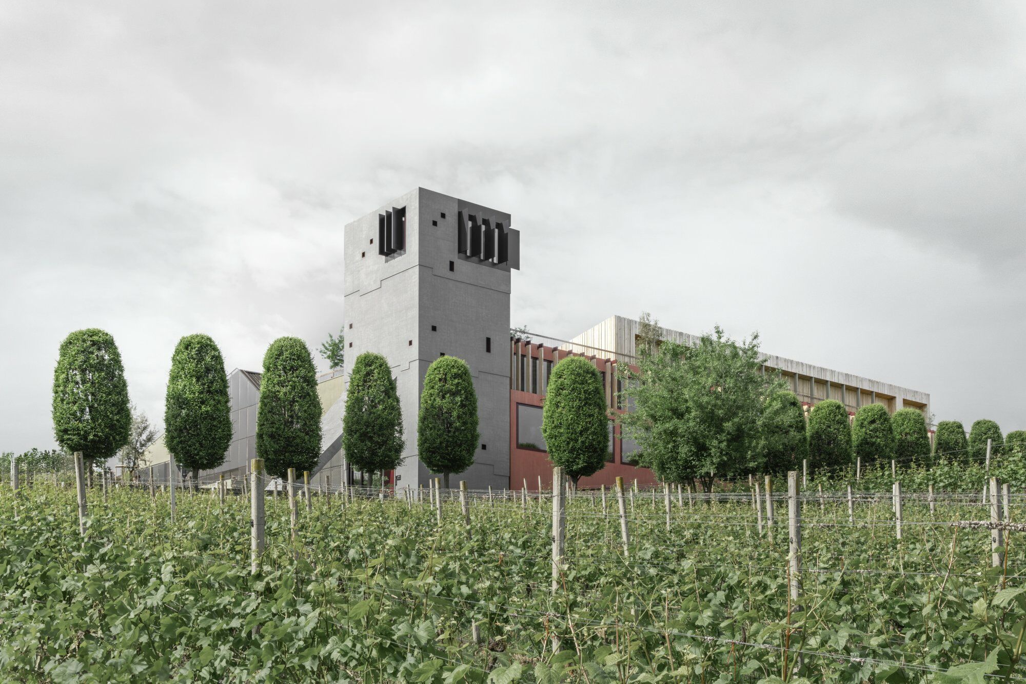 Die Zusammenarbeit zwischen Kellerei und Architekturbüro reicht bereits über ein Jahrzehnt zurück. Ihren Anfang nahm sie mit der Neuordnung der schlichten Bestandsbauten zu einem zusammenhängenden Produktionskomplex – ohne Abrisse, dafür mit einer Verbindung von Altem und Neuem durch farbigen Sichtbeton, Holz und Metall. Der Haupttrakt mit Abfüllanlage, Büros und Flaschenlager erhielt eine neue Fassade aus Eichenholz. Gegenüber befindet sich eine langgestreckte, schwarz geschichtete Metallkonstruktion. Sie überspannt eine große, offene Arbeitsfläche, die während der Weinlese als Sammelpunkt für die Trauben dient und sonst als Ort für „geselliges Zusammensein“ genutzt werden kann, so die Architekt*innen.