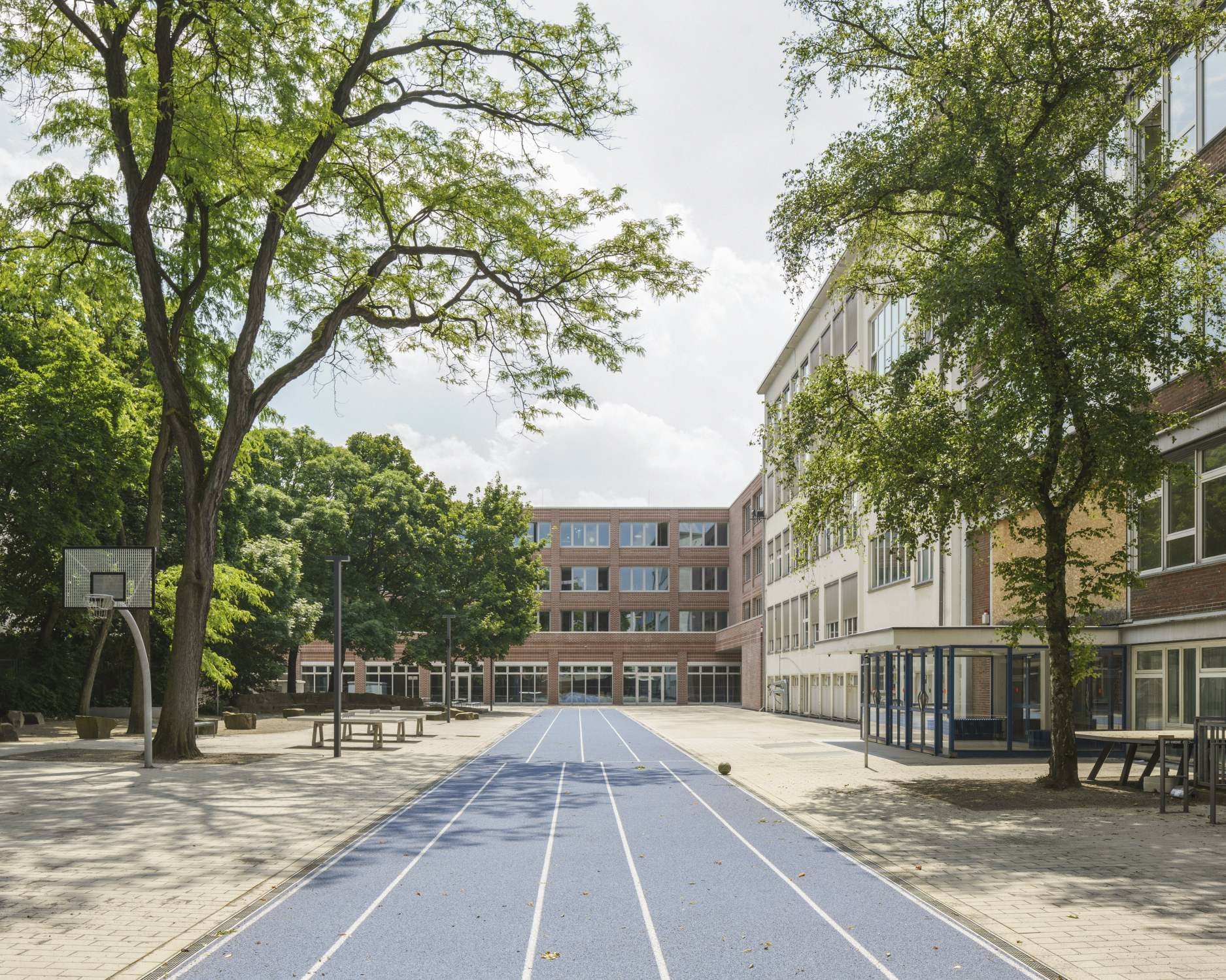 Vor etwa 15 Jahren stürzte das Stadtarchiv in Köln aufgrund fehlerhafter Tiefbauarbeiten der Stadtbahn ein. Als eine der Reaktionen darauf initiierte die Stadt 2012 einen nichtoffenen Wettbewerb zur städtebaulichen Neuordnung des umliegenden Georgsviertels und zur Erweiterung der nahegelegenen Kaiserin-Augusta-Schule. Als Sieger gingen damals ZILA Architekt.innen aus Leipzig hervor. Im vergangenen Jahr wurde der Anbau an das in den 1950er und 60ern errichtete Gymnasium fertiggestellt.