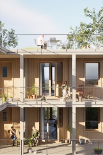 Ohne die Anwendung des „Einfach Bauen“-Forschungsprinzips von Florian Nagler wären weder die (nicht offiziell bestätigte) Bausumme von ca. 40 Millionen Euro noch die günstige Miete denkbar, die etwa um die Hälfte unter dem ortsüblichen Wert liegt. Wie in Bad Aibling umgesetzt und inzwischen vielfach prämiert, setzt Nagler auf eine pragmatische Konstruktion, in diesem Fall aus Holz, auf einfache, wartungsarme Haustechnik und robuste Materialien wie etwa Böden aus Sichtestrich. Wohnqualität versprechen die Bilder auch ohne goldenen Wasserhahn und Eichenparkett: Es gibt breite Laubengänge, eine für alle Mieter*innen zugängliche Dachterrasse und den sogenannten Dschungel, eine begrünte Gemeinschaftsfläche zwischen den beiden Riegeln. Sollte das Haus für München tatsächlich bis 2025 mit den genannten Zielstellungen realisiert werden, könnte es sich ohne Weiteres zu einem Prototyp für München und andere Städte und Gemeinden entwickeln – zum multiplizierbaren Miet-Wunder. (kv)