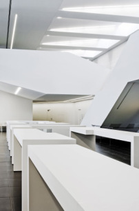 Übergeordnete Nutzungen wie Empfang, Aula, Bibliothek, Festsaal, Mensa und Cafeteria reihen sich in schlüssiger Abfolge entlang der variierenden Höhenschichtung dieses Zentralbereichs. Wegeführung und Nutzungsbestimmung bilden in ihrer Komposition ein lichtes Raumvolumen, durchzogen von visuellen wie atmosphärischen Beziehungen. In gestalterischer Entsprechung wechseln Brücken, Sitzstufen, zugewiesene Funktionsbereiche und Lufträume einander ab und ergeben in ihrer Komposition eine innerräumliche Struktur.“