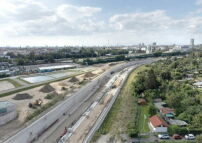 Blick von der Neuköllner Dieselstraße Richtung Berliner Zentrum auf die angedachte Morgenfarm Berlin im bereits realisierten A100-Trog.