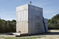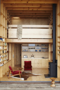 Wenn die Läden vor den Fenstern zugeklappt sind, sieht es aus wie ein monolithischer Holzturm. Sind die Läden allerdings hochgeklappt, öffnen sich dahinter zwei über beide Etagen reichende Glastüren, die auch den Haupteingang zu dem zweigeschossigen Raum dahinter bilden.