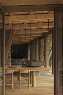 Die Familie möchte das Gebäude als Wochenend- und Ferienhaus nutzen. Die Dimensionen dafür sind üppig: Auf 650 Quadratmetern findet sich Platz für bis zu 18 Übernachtungsgäste. Nach dem Prinzip von Clusterwohnungen kommen sie in Schlafzimmern mit teils eigenen Bädern unter, während sich Küche, Wohn- und Essbereich alle teilen. Die Kinder dürfen also gerne auch ein paar Freund*innen mitbringen. (fh)