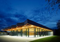 In der Gemeinde Neckartailfingen, 25 Kilometer südlich von Stuttgart, dreht sich fast alles um den Fluss: der Ortsname ebenso wie die Straße, die auf die neue Festhalle zuführt – die Neckarstraße. Die Halle, gegenüber dem Flusspegel leicht erhöht auf einem Plateau gelegen, sucht den Bezug zu dem prägenden Wasserlauf. Dies ist möglich, weil der Durchgangsverkehr hier, im Bereich der Ortsmitte, in einem Tunnel parallel zum Ufer geführt wird.