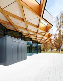Der geschlossene Gebäudeteil im Norden ist wie die Außenseite der an drei Seiten überstehenden Dachkonstruktion mit hinterlüfteten Faserzementplatten verkleidet. Ein geschliffener Sichtestrich verbindet als durchgängiger Bodenbelag die öffentlichen Bereiche wie Foyer, Saal und Mehrzweckraum. Der Baukörper für den Küchen- und Sanitärbereich ist mit dunkel gebeizten Leimholzplatten aus Eiche verkleidet. Eine schwarz lasierte Sichtbetonwand trennt den Bühnenbereich vom Saal. – Die neue Festhalle am Fluss hat 3,4 Millionen Euro gekostet.