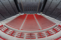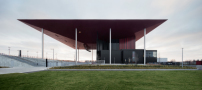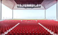 Das Amphitheater ruht auf einem Betonfundament, das auf dem unebenen Gelände eine Plattform für Bühne und Zuschauerraum bildet. Einen Großteil der Technik und die Verwaltung des Theaters bündeln die Architekten in einem geschlossenen Kernbau aus Stahlbeton. Dessen Fassade aus schwarzen Stahlpaneelen setzt sich kontrastreich von den dunkelroten Paneelen des gewaltigen Segeldaches ab, das sich weit oberhalb des Kernbaus erstreckt. In seiner Mitte beherbergt das Dach einen Teil der Bühnentechnik. Hierdurch wächst es auf eine Dicke von sechs Metern an, verjüngt sich aber am First wieder zu einer schmalen Linie. Das Besucherfoyer aus Glas dockten die Architekten quasi an den schwarzen Kern an. Das ist, im Vergleich zu der schweren Stahlfassade, auch einmal leicht in Szene gesetzt. (sj)