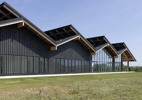 Anzumerken ist außerdem, dass die traditionelle japanische Yakisugi- beziehungsweise Shou Sugi Ban-Methode mit Blick auf die Bedürfnisse der zeitgenössischen Architekturproduktion deutlich angepasst wurde. Holzbretter im Dreieck aufstellen und mit Papier ausstopfen, um mittels des Kamineffekts eine gleichmäßige Verkohlung zu erreichen? Fujimori lehrt dies in seinen Workshops, aber in industriellem Maßstab werden natürlich längst andere Techniken genutzt. Moderne Holzbeflammungsanlagen sichern beispielsweise eine konsistentere Beschaffenheit des Fassadenmaterials. Und statt japanischer Zeder finden bei europäischen Herstellern längst auch Fichte, Lärche oder Douglasie Verwendung.