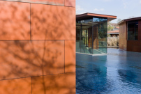 Als Inspiration für den Entwurf diente aber nicht das lebendige Element Wasser, sondern Musik und Mathematik. Die Architekten griffen für die Gestaltung der Gebäude auf eine Skizze des Komponisten Istvan Anhalt zurück: „Symphony of Modules“, zu finden in den „Notationen“ von John Cage. Die jeweiligen Grundrissgeometrien des Eingangsgebäudes, des Wohnhauses und des dritten Gebäudes, das für Veranstaltungen genutzt wird, scheinen sich aus der darunterliegenden Ebene herauszudrücken; das Wasserbecken stellt einen visuellen Bezug zwischen dem oberen, rot schimmernden mit patinierten Kupferpaneelen verkleideten Gebäudeteil, und dem unteren Geschoss aus hell strukturierten Betonplatten her. Ein kunstvolles Betonrelief ziert den unteren Eingang.