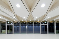 Das zentrale raumbildende Element ist das Deckentragwerk: Brettschichtholzträger überlagern sich und formen blattartige, geschwungene Spitzbögen. In Analogie zur hölzernen Kirchendecke hat das Darmstädter Büro diese an gotisches Maßwerk erinnernde Deckenstruktur entwickelt. Als Gegenmotiv zum geschlossenen Kirchenraum hingegen setzen die Architekten auf Licht und Transparenz: Oberlichter sind in die Decke eingefügt, Schiebeelemente anstelle von Türen ermöglichen den Austritt aus den Räumen des Gemeindehauses ins Freie und die Fassadenflächen verstärken über raumhohe Verglasungen den Charakter eines „offenen Hauses“.