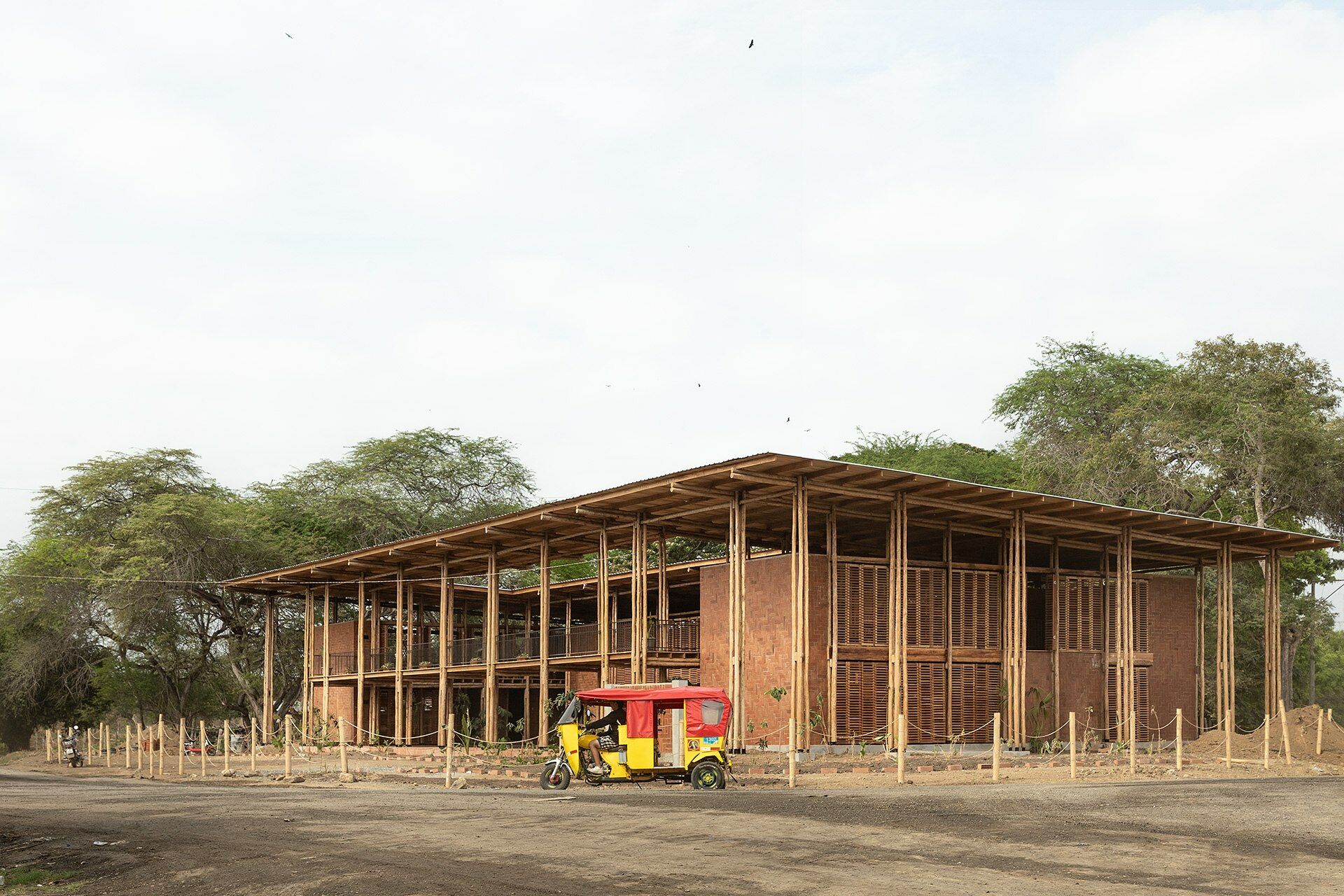 Das Haupttragwerk des Baus bildet eine Zangenkonstruktion aus runden Teakholzstämmen. Dieses Holz sei stabil, langlebig und widerstandsfähig gegen Pilz- und Insektenbefall, so das Planungsteam. Die Ziegelwände im Fischgrätmuster sind durch ihr Ineinandergreifen ausgesteift. Die lamellierten Falttüren sorgen für natürliche Belüftung und schaffen eine Verbindung zwischen Außen- und Innenbereich. Zudem begünstigen sie eine flexible Nutzung, denn dadurch lassen sich die Räume leicht für kulturelle Veranstaltungen oder Workshops anpassen.