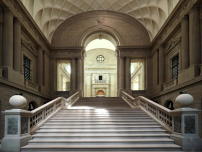 Die Haupttreppenhalle führt in das 19 Meter hohe Foyer, das von einer Kuppel mit Oberlicht bekrönt wird. Die ursprüngliche Form der bauzeitlich als Rabitzkonstruktion ausgeführten Kuppel konnte nicht wiederhergestellt werden. Dies lag daran, dass die historischen kreuzenden Betonbögen inzwischen denkmalgeschützt sind und aufgrund einer geringen Absenkung nicht integrierbar waren. Deshalb entschieden sich die Architekt*innen für ein schlichtes, weiß verputztes Kreuzgratgewölbe, das von der Dachkonstruktion abgehängt ist. Lediglich ein Ring aus glasierten Majolikakeramiken ist erhalten und steht exemplarisch für die vormals pompös dekorierte Kuppel.