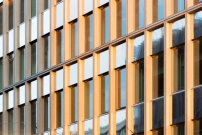 Die Betonkonstruktion des Météo-Bestandsbaus wurde erhalten und neu verkleidet. Die neuen Büros und Werkstätten des IGN befinden sich im neuen Stahlskelettbau. Die Flure im kompakten Riegel nehmen die Servicefunktionen auf. So wird das Verhältnis von Fassadenfläche und Nutzfläche optimiert. Insgesamt 535 vorgefertigte Module aus Fichtenholz sorgen je nach Fassadenausrichtung und Jahreszeit für „angepasstes natürliches Licht“. Die einheitlichen Rahmen mit doppelter Geschosshöhe und 1,40 Meter Breite sind je nach Funktion mit Fensterflächen, Lüftungsklappen und reflektierenden Stahlpaneelen ausgestattet.