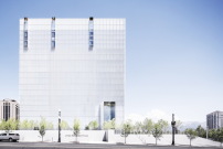 Erschlossen wird das Gebäude mittels eines einfachen Einschnitts in der Fassade, der in ein dreistöckiges Foyer führt. Dort folgt die eigentliche architektonische Überraschung, denn hinter den Aluminiumlamellen ist die Fassade nicht blind, sondern großzügig verglast. Das gleißende Licht der Wüste ergießt sich damit auch ins Innere, was allerdings die Begegnung mit Justitia leicht zu einer flirrend-surrealen Erfahrung werden lässt. (sb)