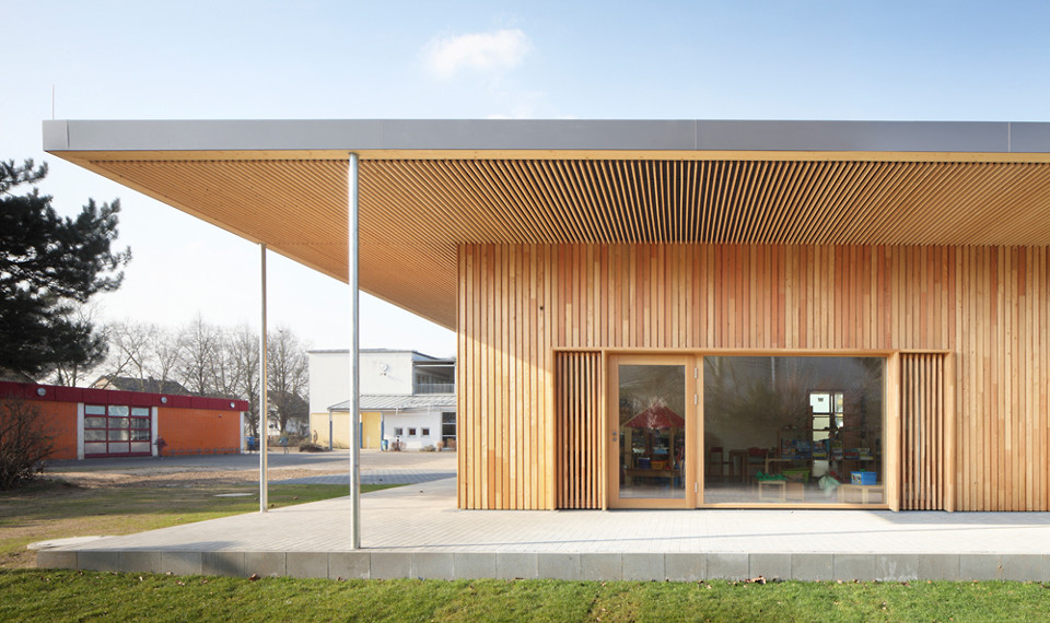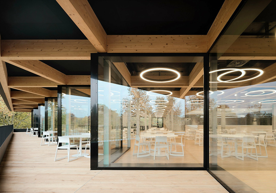 Konstruktiv handelt es sich um eine modulare Hybridstruktur aus Holz und Beton. Auf dem teils mit hellem Metall verkleideten und teils aus Glasflächen bestehenden Sockel sitzt die markante, fast schon brutalistisch anmutende Dachstruktur aus Holz, in der partiell auch die technische Ausstattung untergebracht ist. Sie kragt gebäudeumlaufend leicht aus, vor dem zum Park hin orientierten Speisesaal sogar so weit, dass eine wettergeschützte Terrasse entstand. Halbkreisförmige Einschnitte akzentuieren die Dachplatte an allen vier Seiten. Ein Rücksprung an der südlichen Front markiert die Verladezone.