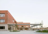 Er besteht aus zwei kompakten, rechteckigen und dreigeschossigen Gebäudeteilen, die so gegeneinander versetzt sind, dass sie zwei Freiräume bilden: einen kleinen Platz nach Nordwesten, der sich als öffentlicher Raum und Haupteingang der Schule zur Stadt öffnet. Und einen zweiten Platz nach Südosten, der sich zu den Sportflächen samt Tribünen- und Umkleidegebäude öffnet. Die Sportplätze gehen beinahe nahtlos in die Felder der Umgebung über.