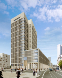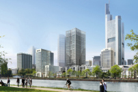 Den gesamten Komplex aus einem 70 Meter-Hochhaus und einer siebengeschossigen Blockrandbebauung auf 20.000 Quadratmetern sehen die Architekten als „Solitär und Stadtbaustein zugleich“. Denn der für Frankfurt moderate Turm ist einerseits deutlich sichtbar, vermittelt aber auch zwischen dem Bankencluster und der niedrigeren Bebauung des Mainufers.