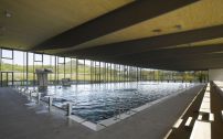 Der kompakte Bau liegt auf einem sanft ansteigenden Hang und ist in zwei Ebenen gegliedert. Die Architekten platzieren Foyer, Umkleidekabinen und Technikräume auf der unteren Straßenebene und trennen damit den Badebetrieb räumlich ab. Dieser befindet sich in der oberen Ebene. Zu drei Seiten hin ist das Volumen komplett verglast, so dass das Geschehen um das 50 mal 21 Meter große Becken einsehbar ist. Nur die Straßenfassade ist teilweise aus hellem Stein. Über den fragilen Glaswänden kragt das flache und parallel zum Hang ansteigende Dach weit aus.