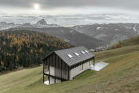 Die typologische Einordnung könnte prosaischer nicht ausfallen: Als „Betrieb mit Dienstwohnung“ kategorisiert Daniel Ellecosta die Ciasa Le Fiun, die im letzten Jahr fertig wurde. Vor drei Jahren hatte der 1989 geborene Südtiroler sein eigenes Haus am Hörmannweg in Truden vorgestellt, in dem er mit seiner Familie lebt und sein Büro betreibt. Nun also ein weiteres Projekt, das dem Wohnen und Arbeiten dient, wieder im dörflichen Kontext, wieder am Hang und wieder mit Blick in die Berglandschaft (für Ortskundige: Richtung Peitlerkofel).