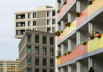 Städtebaulich ist dieses Projekt bemerkenswert: Es ist das erste Hochhaus in Jena nach der Wende. Und es ist umgeben von den zehn- bis zwölfstöckigen Riegeln der Trabantenstadt Neulobeda, wo von 1966 bis 1986 Wohnraum für über 20.000 Menschen geschaffen wurde. Anstatt solch dichte Siedlungen wie Neulobeda zu dezimieren, wie dies lang im Rahmen des Stadtumbau Ost üblich war, verdichteten die Architekt*innen von kister scheithauer gross (Köln, Leipzig) und ihre Bauherrin, die kommunale jenawohnen GmbH, im Maßstab der Riesenwohnkomplexe aus der DDR-Stadtplanung nach.