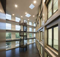 Ksg ständerten das Gebäude wegen der Topografie auf und legten seine Erschließung über eine Fußgängerbrücke an, die zum Lobeda-Park weiterführt. Das Erdgeschoss ist großflächig aufteilbar. Die Verwaltungseinheit des Universitätsklinikums beginnt im ersten Obergeschoss mit einem Empfangsbereich, der den Besucher*innen den Blick in das Atrium mit Wendeltreppe freigibt. Dieses dient den Büros als zentraler, verbindender Raum für Meetings und kleinere Versammlungen. Für die Mitarbeiter*innen des Uniklinikums sind auf jeder Ebene sowohl ein großer Besprechungsraum als auch eine Teeküche integriert.