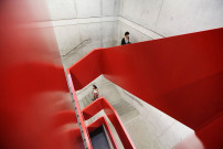 Im Inneren des Neubaus kontrastiert grauer Sichtbeton mit knallig roten und orangenen Decken- und Wandverkleidungen.