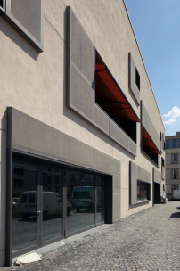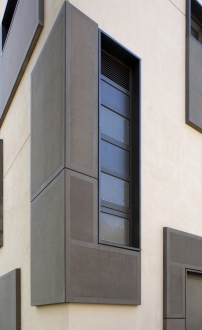 Die Fassade des Gebäudes besteht aus einem Wechselspiel von Öffnungen und dunklen Betonwerksteinen, die frei auf der hellen Putzfassade verteilt wurden. Zentrale Bedeutung im Inneren übernimmt das Treppenhaus mit gestalteten Blickbeziehungen. Über einen zweigeschossigen Übergang werden die benachbarten sanierten Bestandsbauten erschlossen.