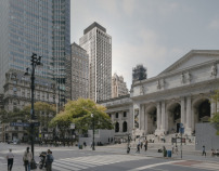 Der äußerst belebte Bryant Park in Midtown Manhattan gehört durch seine Lage zwischen den Straßenschluchten an der Fifth Avenue und die spektakuläre Bebauung wohl zu den bekanntesten grünen Platzanlagen New Yorks. Umgeben von Architekturikonen verschiedener Epochen – dem Chrysler Building, der New York Public Library, dem McGraw-Hill Building oder dem Knox Building im Beaux-Arts-Stil – verkörpert Bryant Park auch atmosphärisch ein Konzentrat der Stadtgeschichte. An der südwestlichen Ecke, eingepasst in die höhenverspringende Gebäudestruktur entlang der 40th Street, haben David Chipperfield Architects (London) im Auftrag der HFZ Capital Group 2013-2021 einen 115 Meter hohen Hotel- und Wohnturm geplant und umgesetzt.
