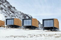 Zum Schutz des Nationalparks wurden die Module auf Stahlpfosten statt auf schweren Betonfundamenten installiert, die zudem den Schnee von der Unterseite der Häuser fernhalten sollen. Die Vorfertigung reduzierte dabei nicht nur die Bauzeit vor Ort, sondern minimierte auch den Abfall. Darüber hinaus können die Gebäude vollständig demontiert und ohne Abrissarbeiten an einen neuen Standort umgesetzt werden. Die Formgebung der Gebäude – jedes mit einer Sauna ausgestattet – wurde vor allem von den einwirkenden Wind- und Schneelasten bestimmt, verkleidet wurden sie mit Holzschindeln und lackierten Aluminiumpaneelen. Panoramafenster geben den Blick auf die kasachischen Gipfel frei, Ausläufer des Hochgebirges Tian-Shan. Zu Deutsch: Himmelsgebirge. (kat)