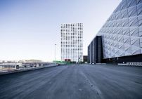 Die Fassade bestimmt nicht nur die äußere Gestaltung, sondern auch die Innenräume. Bei den Grundrissen hatten die Architekten zwar wenig Spiel – dazu ist die Hotelbranche heute viel zu sehr auf Kosten/Nutzen getrimmt. Wer aber in seinem Hotelzimmer auf dem Bett sitzt oder aber im Restaurant in der 25. Etage, der schaut aus einem großen Kreis in die Landschaft. Eigentlich keine schlechte Inszenierung – doch da das Hotel direkt neben der sogenannten Friends Arena in Solna gebaut wurde, könnte der Ausblick sicher schöner sein. Nebenan wird demnächst eine Shopping Mall gebaut, hierfür wurden ebenfalls Wingårdh Architekten beauftragt. (jk)