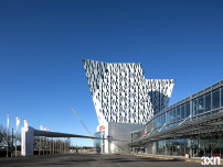 „Bella Sky“heißt das Hotel, das mit seinen zwei 76 Meter hohen „Türmen“ bereits jetzt die Skyline von Kopenhagen prägt. Die Landmarke weist eine besondere Eigenschaft auf: Die Seiten der Fassade sind um 15 Grad nach außen geneigt. Dadurch entstehen unterschiedliche Ansichten des Gebäudes: Je nachdem, von welchem Standpunkt aus man es betrachtet, erscheint es einmal als X, ein anderes Mal als V. Das Gebäude sieht damit richtig schön schräg aus, eine Eigenschaft, die es zum Stadtmarketing-kompatiblen künftigen Wahrzeichen adelt. Die Fassade der beiden Turmscheiben wird aus unterschiedlichen polygonalen Fenstern – von dreieckig bis rautenförmig – gebildet.