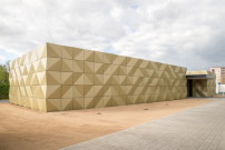 Mehr als auffällig ist natürlich die Fassade aus Aluminimuplatten. Die Architekten entwickelten diese in Auseinandersetzung mit den Formsteinwänden aus Beton, die an vielen Plattenbauten zu finden sind und zu den architektonisch interessantesten Elementen im Bezirk zählen. Die Übersetzung dieses Motivs aus den 1970er Jahren in eine zeitgenössische Fassade soll Bezug zum Ort und Identität schaffen. Einerseits ist das inhaltlich sicherlich angebracht, andererseits dickt die umfassende Verkleidung den kleinen Baukörper ästhetisch vielleicht etwas zu sehr auf. (gh)