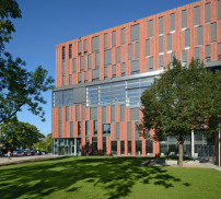 Dieses spiegelt die innere Raumorganisation wider: Die Labore und Seminarräume sind als Split-Level-Typen „mit maximaler Transparenz“ angelegt. Glaswände überwiegen, über viele Ebenen hinweg gibt es Sichtbeziehungen und immer wieder eingestreute Flächen für den kollegialen Austausch. Nach Süden dominieren warme Farben, nach Norden kühle Laboreinrichtungen. Ein kreisrunder, geschlossener Vortragsraum vervollständigt das Programm, und natürlich gibt es im Untergeschoss den in Holland obligatorischen großen Fahrradkeller.