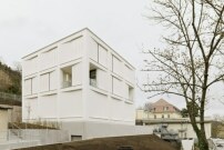 Mit ihrem Projekt konnten Osterwold°Schmidt 2018 einen internationalen Wettbewerb gewinnen. Die kompakte Grundform wählten sie mit Blick auf die benachbarten Villenbauten. Dank seiner Deckenhöhe lässt sich das Laborgeschoss in diesem Sinne auch als eine Art fensterlose Beletage lesen. Die darüberliegenden Büroetagen haben wiederum mit ihren Holzfenstern und Klappläden einen fast schon wohnlichen Charakter.