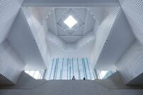 Ähnlich verfuhren die Architekt*innen in den Innenräumen. Hier strukturieren drei Atrien den Bau, die je an einen Iwan angrenzen und Licht in das Gebäude bringen. Das zentrale Atrium mit seiner keramisch verkleideten, gestuften Struktur zitiert die traditionelle islamische Kuppel. West- und Ostatrium erschließen Theater, Festsaal und Lernräume. Herzstück des Gebäudes ist die Gebetshalle – eine stützenfreie Fläche von 35 mal 35 Metern –, die von einer Tragstruktur aus sieben ineinandergreifenden Quadraten überspannt wird. Die doppellagige, perforierte Aluminiumdecke verleiht dem Raum einen schwebenden Charakter.