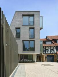 Um auch für das wertvolle Personal adäquat zu sorgen, ließ die Stiftung im Ortszentrum von Ruit, direkt gegenüber des zum Immobilieninventar gehörenden Samariterstifts, ein Wohngebäude errichten. Dieses stellt insgesamt 14 bezahlbare Wohnungen für Pflegekräfte und Mitarbeiter*innen aus der benachbarten Einrichtung zur Verfügung. Die Planung übernahm das ortsansässige Büro Kauffmann Theilig & Partner (Ostfildern), die den Geschosswohnungsbau mit teils öffentlicher Erdgeschosszone geschickt in das historisch gerahmte, zweigeteilte Grundstück einfügte.