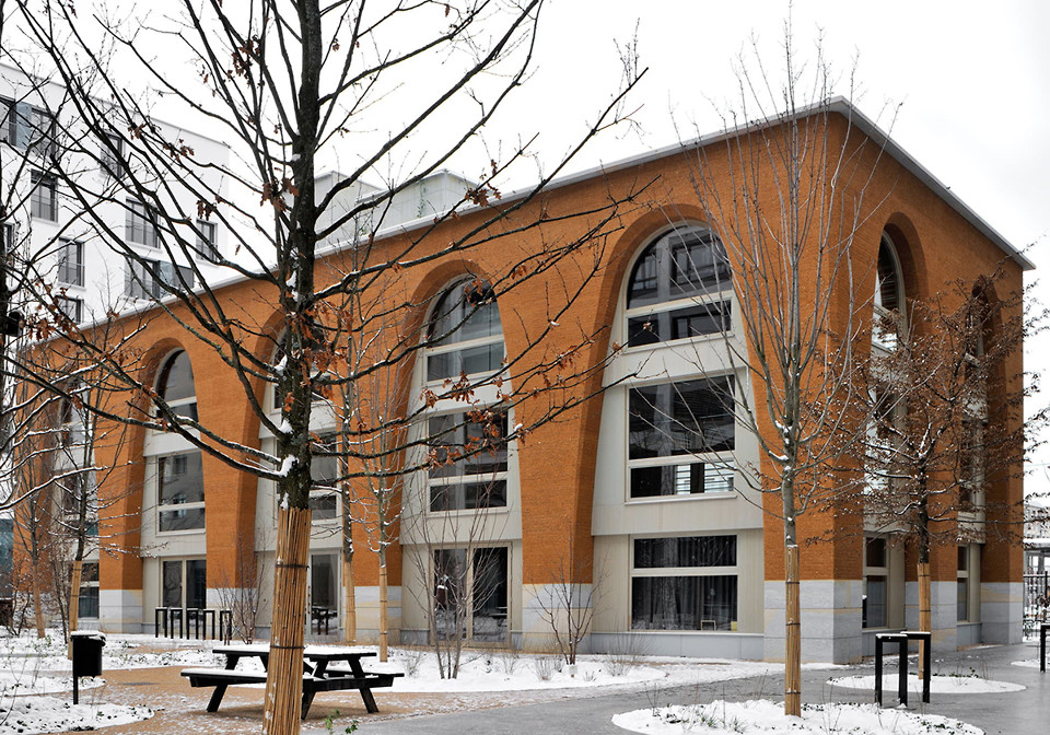 Die fünf Volumen beherbergen Räumlichkeiten für Kindergarten, Grundschule, Hort, Cafeteria und Sporttribüne samt Trainingsbereichen. Die Architekt*innen arrangierten sie so, dass sie den Lärm von der Straßenkreuzung abschirmen und innen einen offenen Hof schaffen, der von Waldkindergärten inspiriert ist. Gemeinsam mit den Landschaftsplaner*innen von Wald (Paris) pflanzte man dort im Sinne der Biodiversität unter anderem Eichen, Eschen, Ahornbäume und Ulmen. Die Dächer wurden ebenfalls intensiv begrünt. Neben Außenanlagen mit rund 3.850 Quadratmetern Fläche gibt es auch eine Tiefgarage.