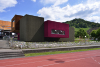 Der kürzlich eingeweihte Kindergartenneubau hört auf den schönen Namen „Farbtupf“. Seine Fassaden sind „kindgerecht“ mit einem weichen Kunstrasenteppich in den Farbtönen „Strohgold, Rotkraut und Olivgrün“ verkleidet – „Kindergartenfassaden zum Streicheln“ halt. Das erläutern die Architekten L3P aus Regensberg im Kanton Zürich. Der Kindergarten, der sich nördlich an die bestehende Primarschule anschließt, steht in dem Dorf Weiach, ebenfalls im Kanton Zürich. Der Hochrhein und damit die Grenze zu Baden-Württemberg ist hier nur wenige hundert Meter entfernt.